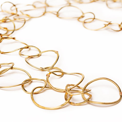 Handmade choker of round links in two sizes, hammered brass finish, with a large irregular, faceted and beveled Aquamarine that hangs in the center. The metal, originally smooth, is worked with a hammer to give it luminosity and relief, thus the piece is enriched with the mark of the craftsman who created it, since depending on the hammer and the force of its blow, this is the finish.