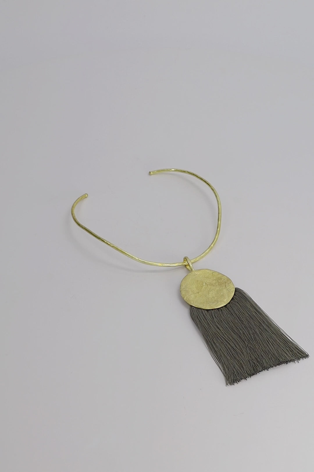 Gargantilla de latón hecha a mano por nuestros artesanos en México. Colgando de la gargantilla rígida martelé, una moneda decorada con hilo en tono salvia.