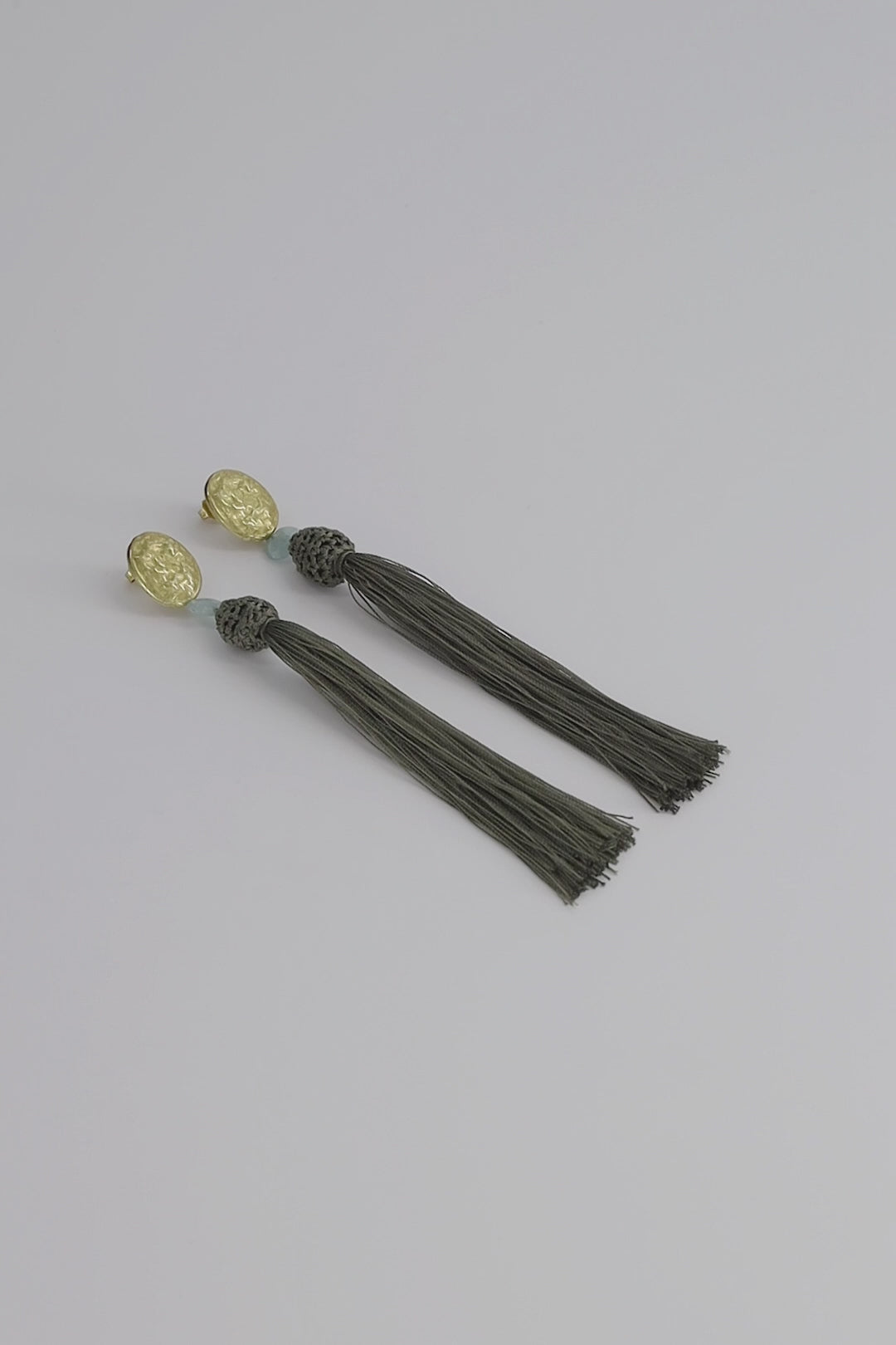Pendiente hecho a mano por nuestros artesanos en México. Una pepa de latón sostiene un granate facetado y una borla de hilo en tono granate.